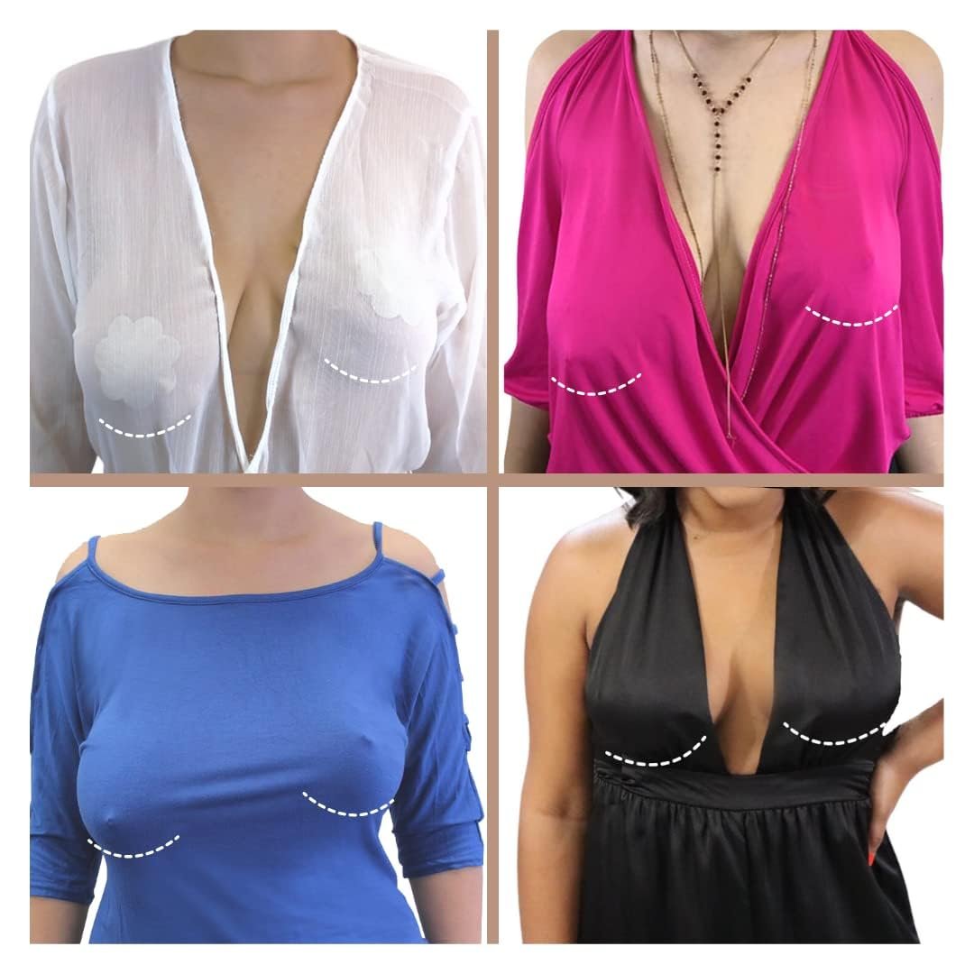 PRE-CUT TO SIZE these horseshoe-shaped stickers were especially designed wider all around for women with large or plus size breasts. The wide and deep diameter cut out in the center protects larger sized nipples/areolas. Nipple pasties or nipple covers can be worn in combination with the adhesive bra.