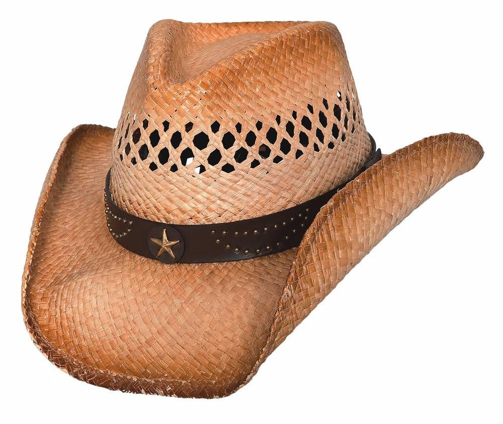 The Alanreed from Bullhide by Monte Carlo is a stylish weathered raffia straw hat boasting a 4 1/4" Pinchfront crown, a 3 1/2" rolled shapeable brim, and a dark brown leather band with a star concho and stud design around the entirety of the band. 4 1/4" Pinchfront vented crown 3 1/2" Shapeable Brim Leather band Star concho and studs