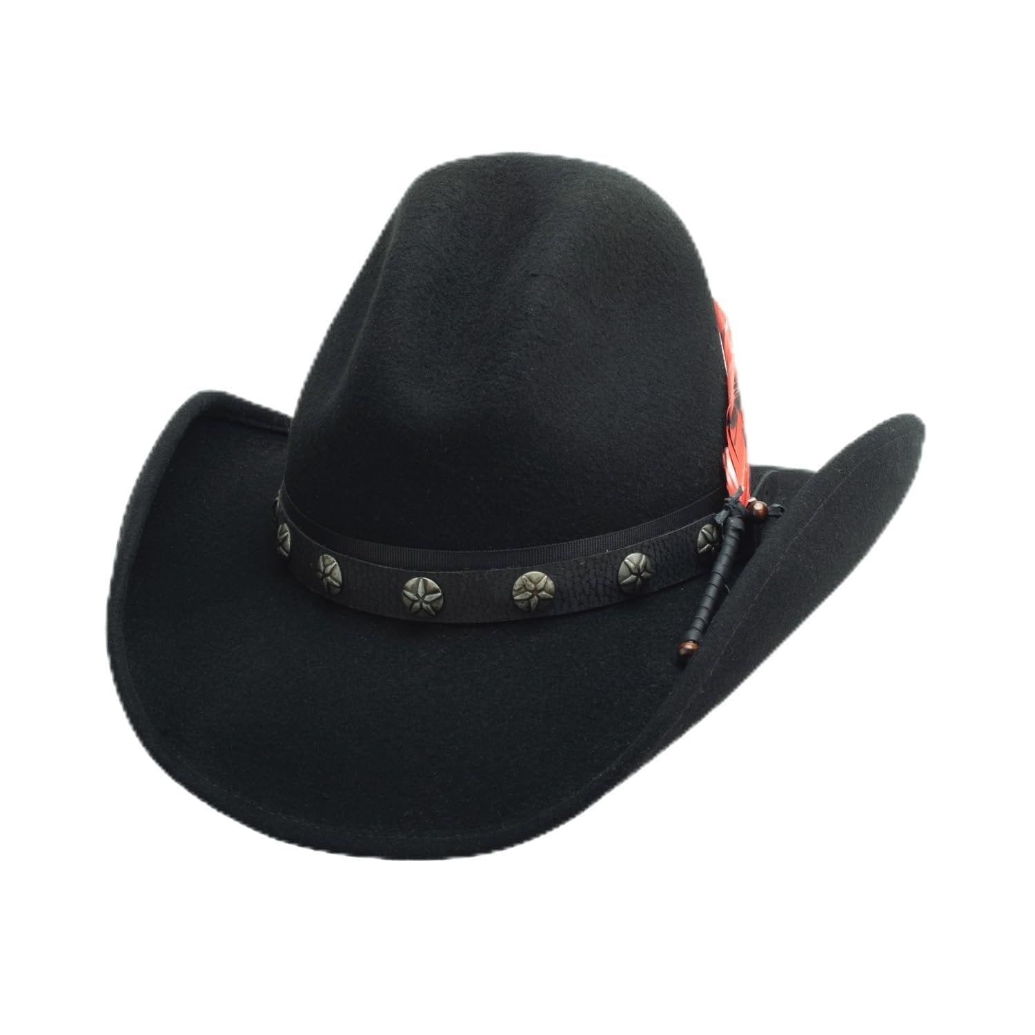 Bullhide Hats have gained special recognition in the western market because of their superior finish, innovative style and exclusive trimmings. These qualities make Bullhide Hats unique. Choosing the right Hat body is only the beginning of the laborious process of making a Bullhide Hat. First each hat body is handcrafted by expert artisans using different materials: Fur felt, wool felt, and natural straws. Before qualifying as a Bullhide Hat, our hats have to pass a careful inspection made by our skilled hatters. Each hat body is hand dipped in a special lacquer, which makes the hats more durable, water-resistant and easy to clean. Unlike some other manufactures that run their hats trough ovens, our hats are allowed to air-dry. This process takes longer, but it allows the stiffener to cure uniformly and eliminates peeling and cracking. After the completion of the stiffening process, the hats are ready for the blocking process. We use heat, pressure, and extreme care to give the hat its final size and shape. Our hats are then trimmed to the proper brim width. On all straw and crushable felt hats we sew a special wire to the brim. This brim wire will allow you to customize your hat to your liking. It is what we call a "U-style it" brim. Then sweatbands are individually fitted to each hat. This is necessary because of the different thickness of bodies and other variables. Some other manufacturers cut the sweatband to a particular size and make it fit the hat. Individually fitting each piece of leather to each hat ensures the best fit and quality. The final steps give the hat its unique touch: We line our hats in satin, when appropriate. Then we trim and decorate them with exclusive leather bands, rhinestones, studs, ribbons and bows, giving each hat the distinctive Bullhide look. Each hat, regardless of price or quality, must pass our rigid quality control inspections. The resulting process ensures a genuine work of art: a masterpiece, a Bullhide Hat.Fashion Felt CollectionColor: BlackBrim: 4