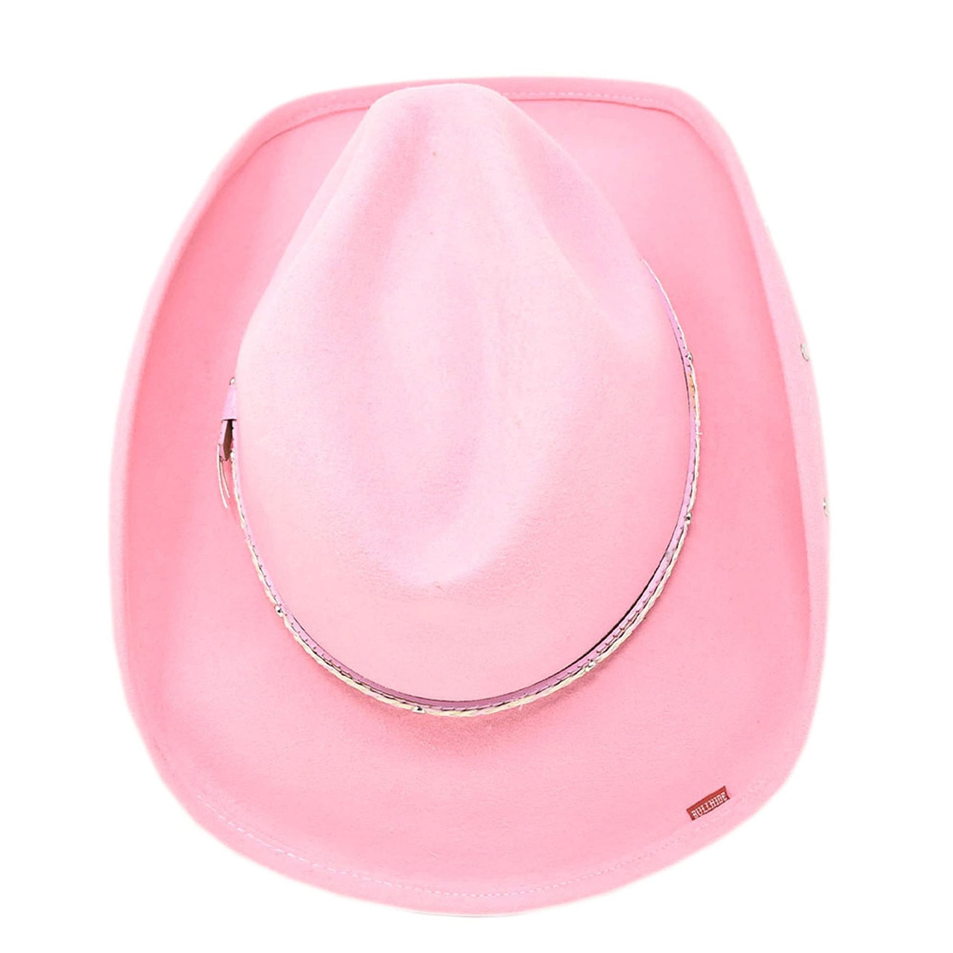 DECORATIVE DETAILS - The Baby Jane Cowgirl Hat is outfitted with braided white and pink hatband with a decorative concho and silver-tone and pink studs; The hat is also decorated under the brim with the same studs