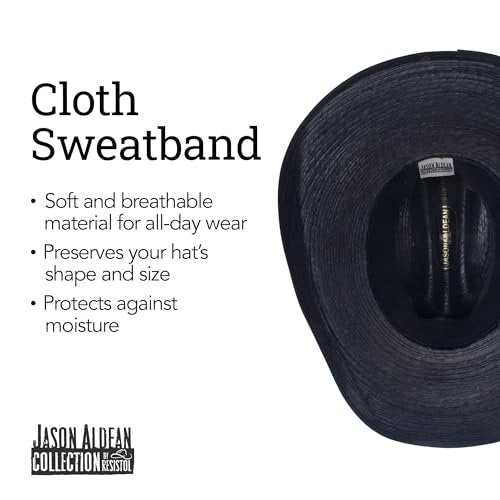 Asphalt Cowboy, from Resistol’s Jason Aldean Collection, is a rustic black Mexican Palm straw cowboy hat that boasts a 4 1/8” bound brim and a black band with a continuous x-stitched pattern through it. The Gus crown, profile JA, measures 3" in the front and 4" in the back.licenced Jason Aldean HatBlack Mexican Palm Straw3" Crown, Gus profile JA4 1/8" Bound BrimLeather band