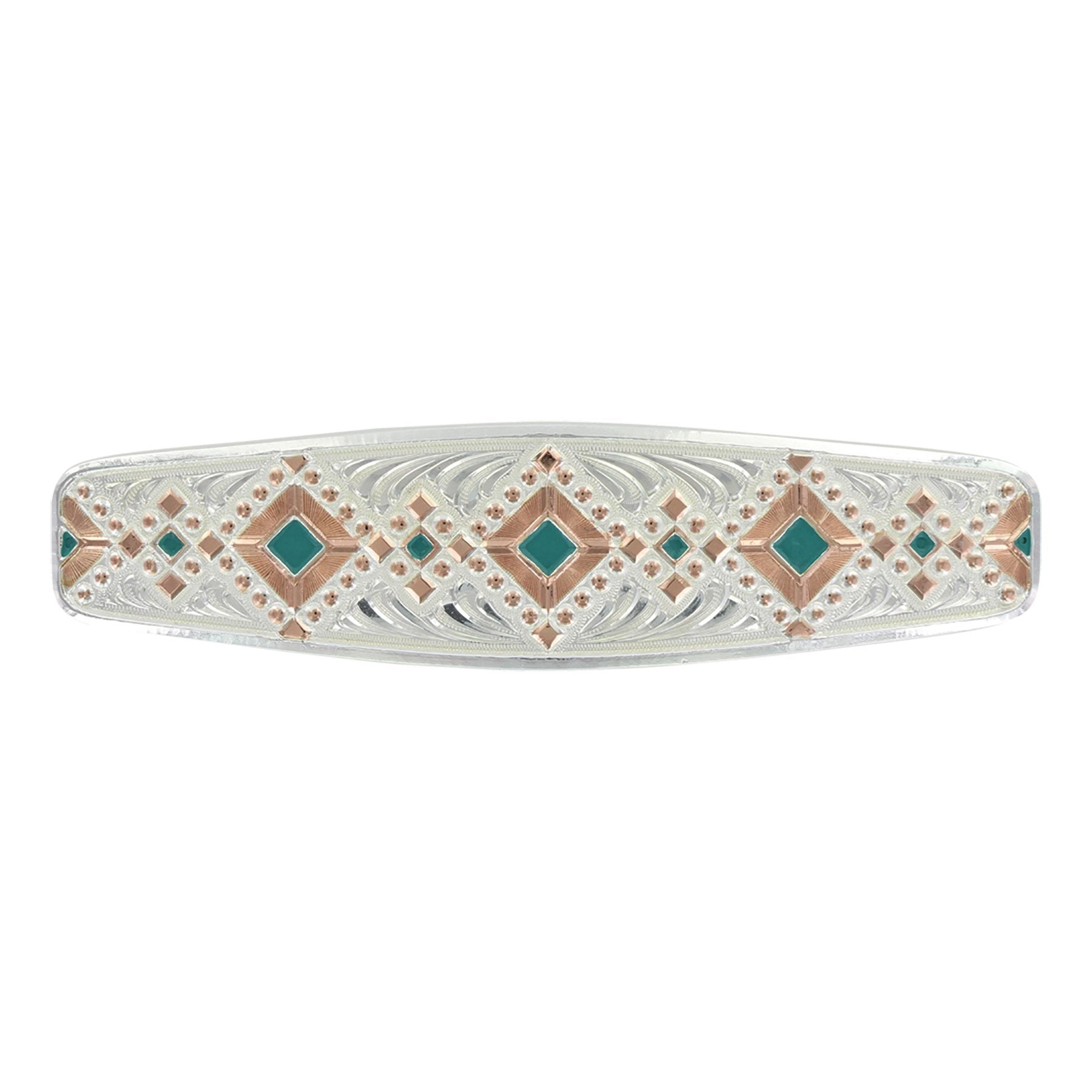 Womens Montana Silversmiths Barrette: Ladies Montana Silversmiths Western Accessory. Compliment your style! This women's two tone southwestern beats barrette from Montana Silversmiths features a repeating pulse like pattern. It has a small hand painted turquoise center diamond has a rose gold finish smooth frame with square dots spaced out on the outside of a smaller square with the turquoise accent and rose gold finished beads on either side of the main square design, like an echo of sound. Bright silver bright cut engraved flourishes caress the sides of the squares with a smooth wire edging finishing the barrette. Made with 99.9% fine silver and 14 karat rose gold plated over a brass base and Montana armor protective finish to prevent tarnish. You can maintain your silver brilliance with an occasional wipe of a damp cloth, DO NOT use chemical or abrasive cleaners. Measures 3.25" x .78" x .78". Made in the USA. BA3713TQWomen's Barrette.