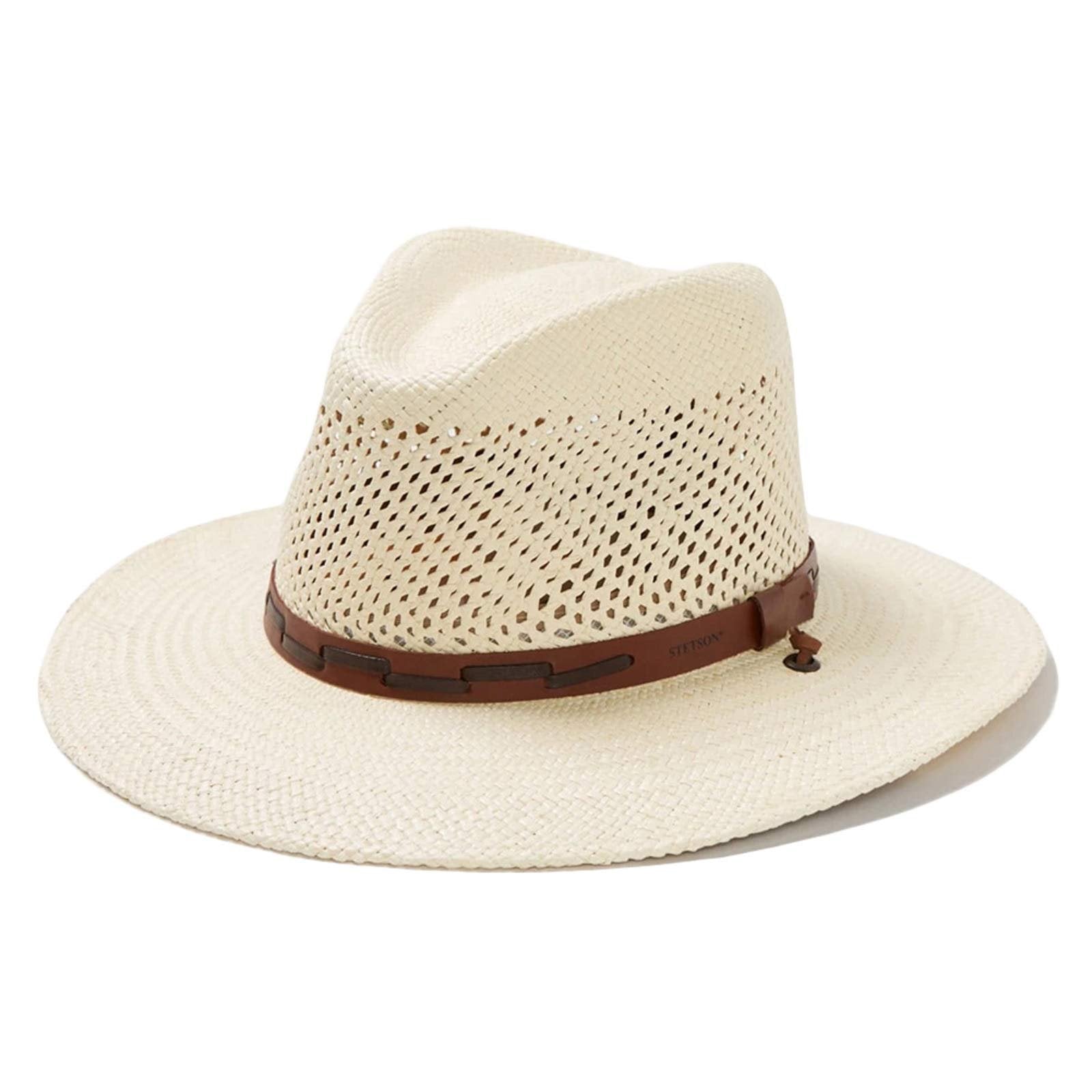 Stetson Men's Stetson Airway Vented Panama Straw Hat, Natural, Medium Crown: 4 1/2" Brim: 3" Genuine Panama Straw Leather Chin Cord with Toggle Vented Crown